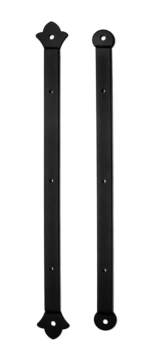 These are used for flat mounting a sign to a wall. They are screwed to the back of the sign, and then mounted to the wall with lag screws through the decorative ends of the strip. Sign mounting holes are countersunk from the back of the strip. Rounded ends are welded stampings 1.5” in diameter. Flower ends are welded stampings and are 2.1875” wide. The strips are 1/4” x 1” material.